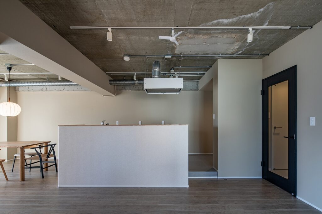既存天井を解体し、現しになったコンクリートの表情を“素材の魅力”としてデザインに取り込むことで、マンション特有の制約を個性へと転換。そこに、オーク材のフローリングや木製建具を合わせ、無機質になり過ぎない落ち着きと上質感を整えました。