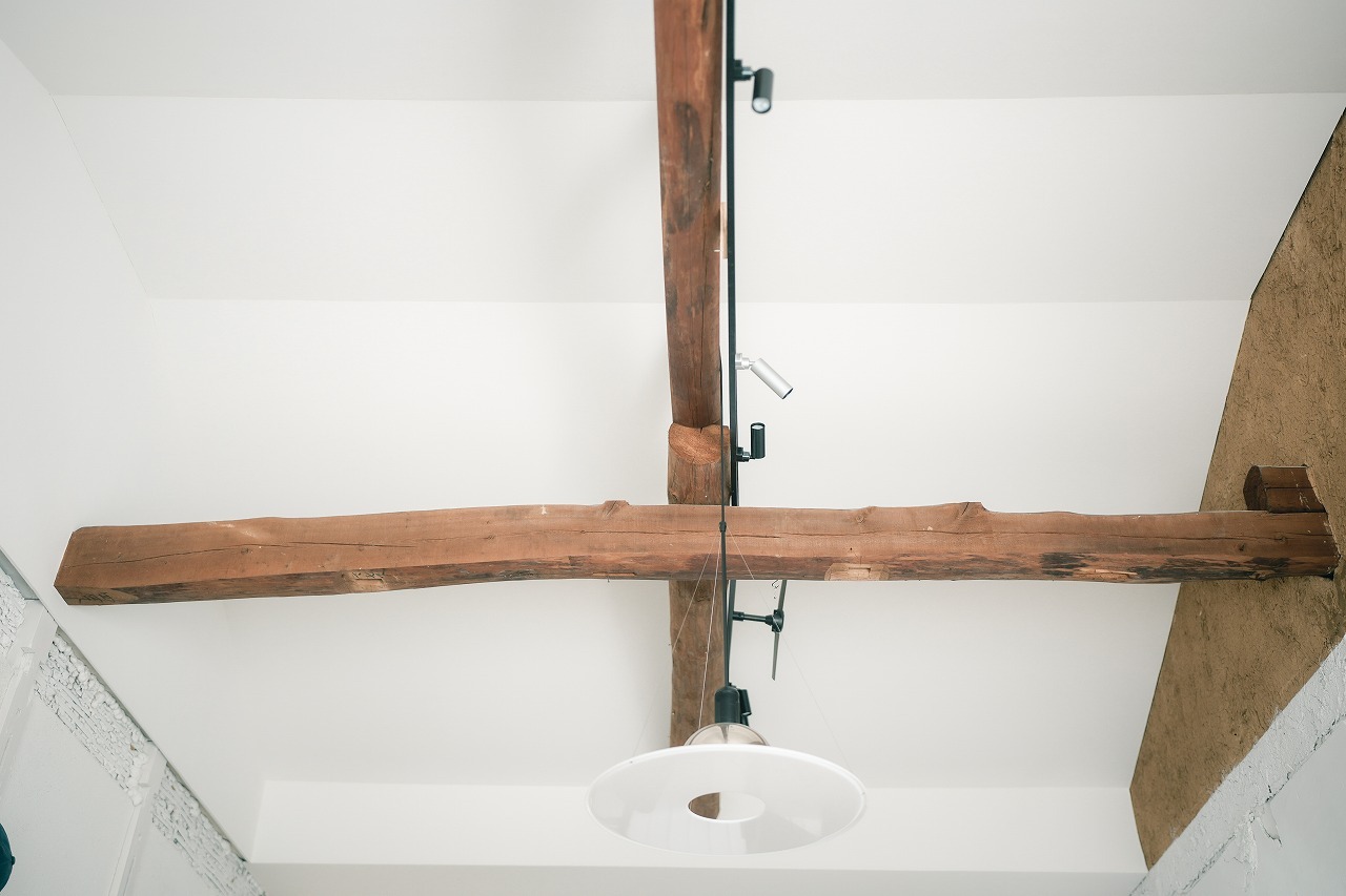 力強い梁はあえて隠さずに露出させ、古民家ならではの時間の積み重なりを感じられる要素として空間の軸に。