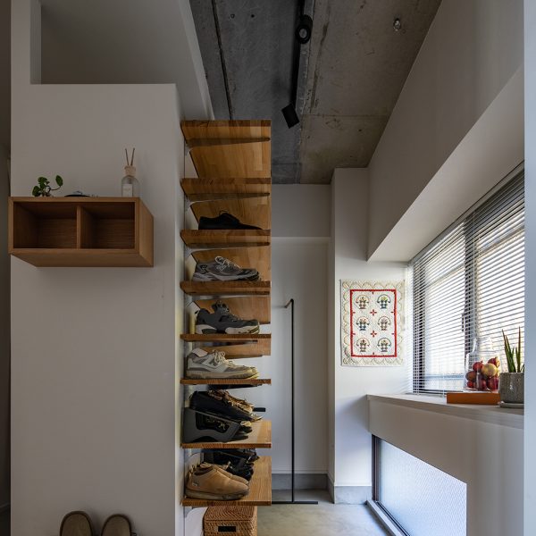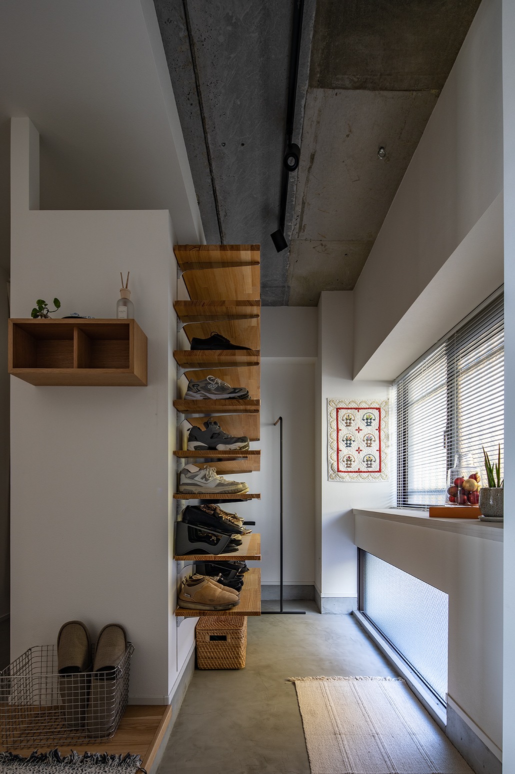 玄関から続く土間スペースは、靴やアウトドア用品、観葉植物の手入れなど、多目的に使える便利な空間。