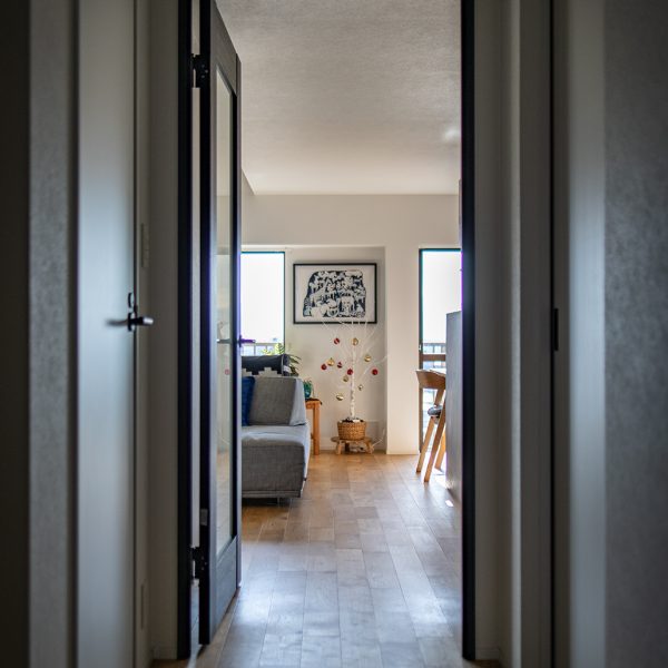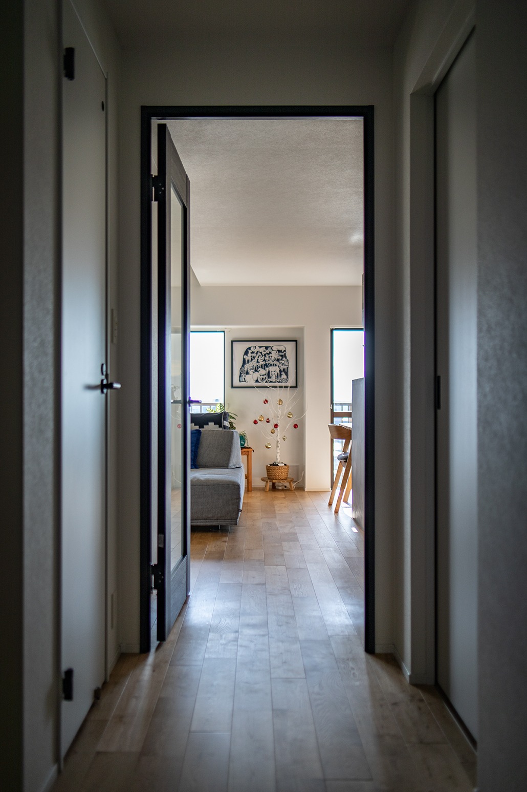 扉で区切らない抜けのある設計のため、LDK全体の広さを感じながらも、ほどよくこもれる絶妙な距離感が実現しています。