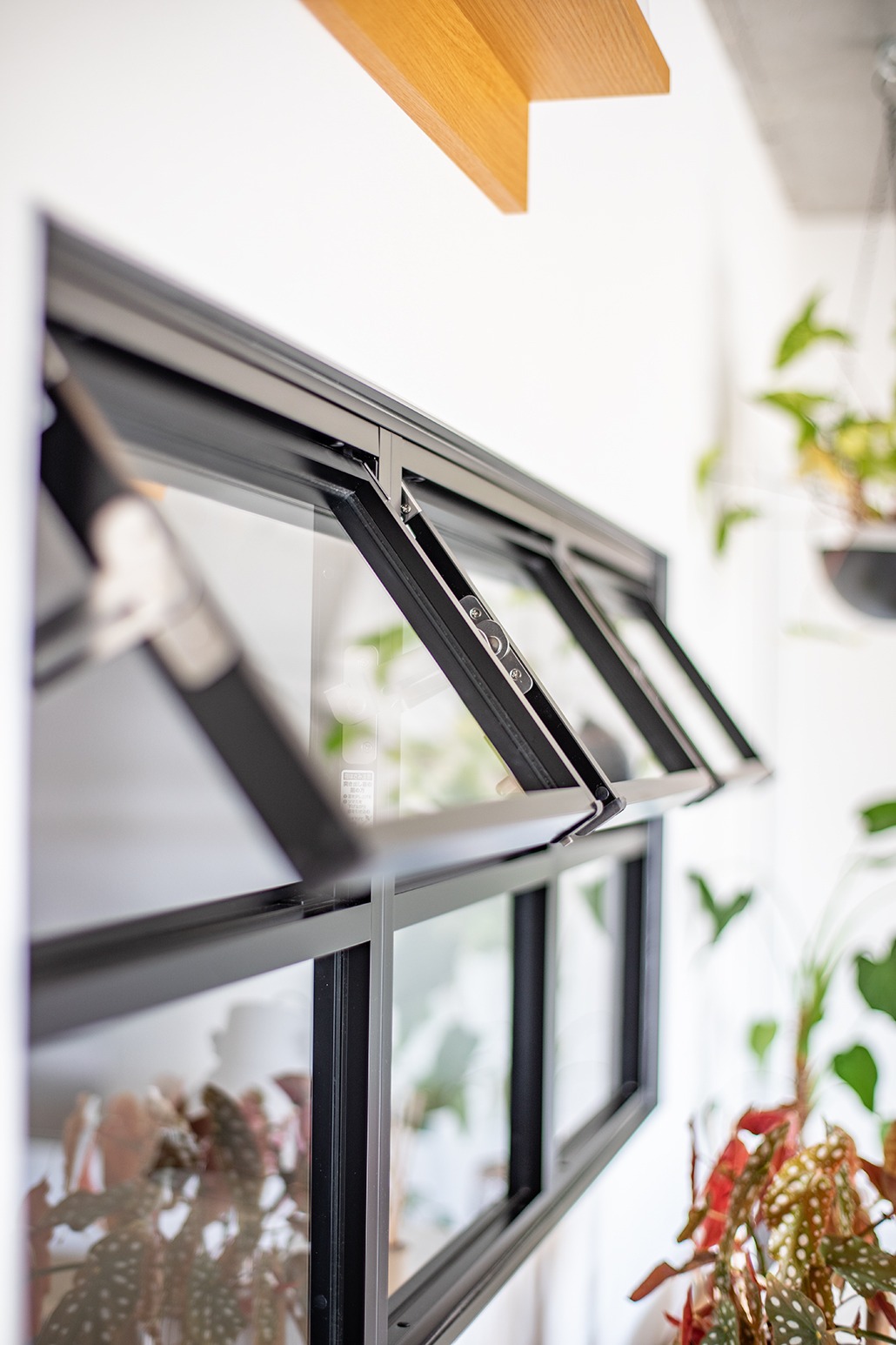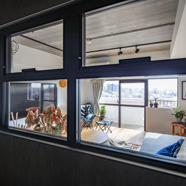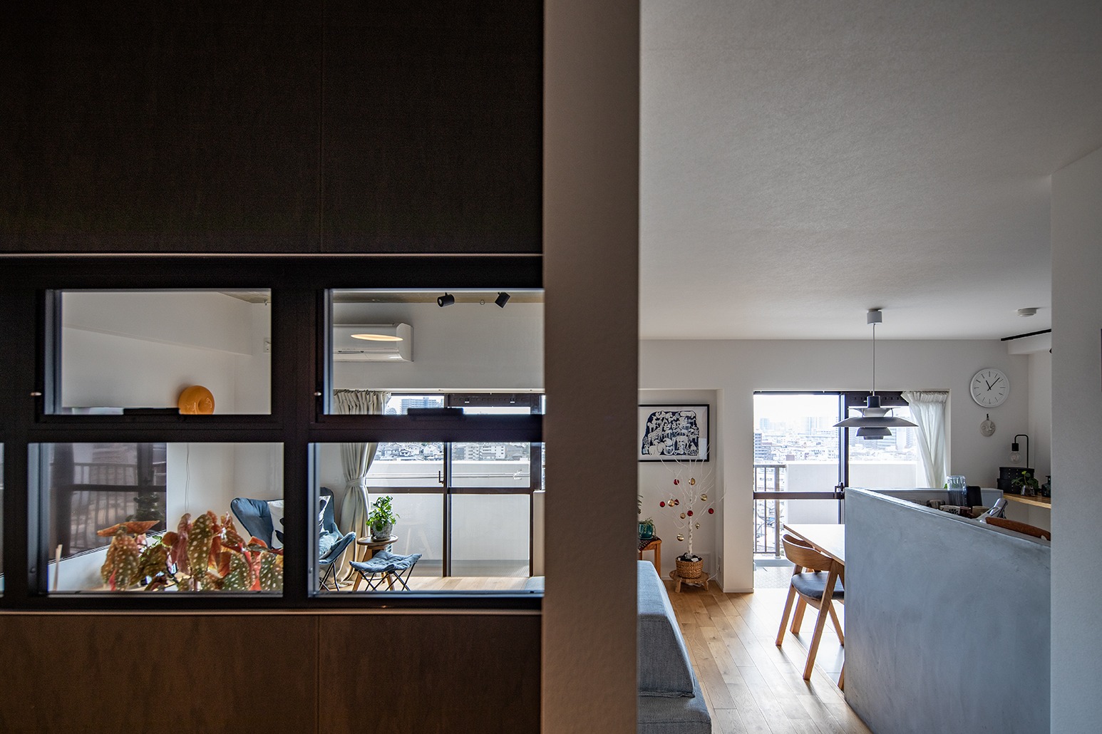 壁や天井はシンプルに、室内窓や躯体あらわしの素材感を適度に取り入れることで、カフェのような“抜け感”のある空間に仕上がっています。